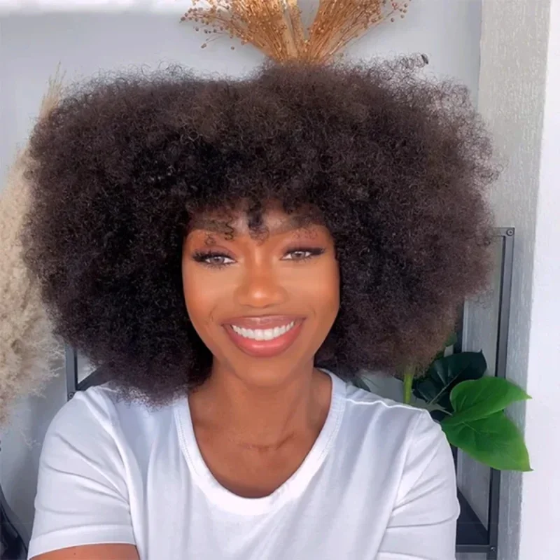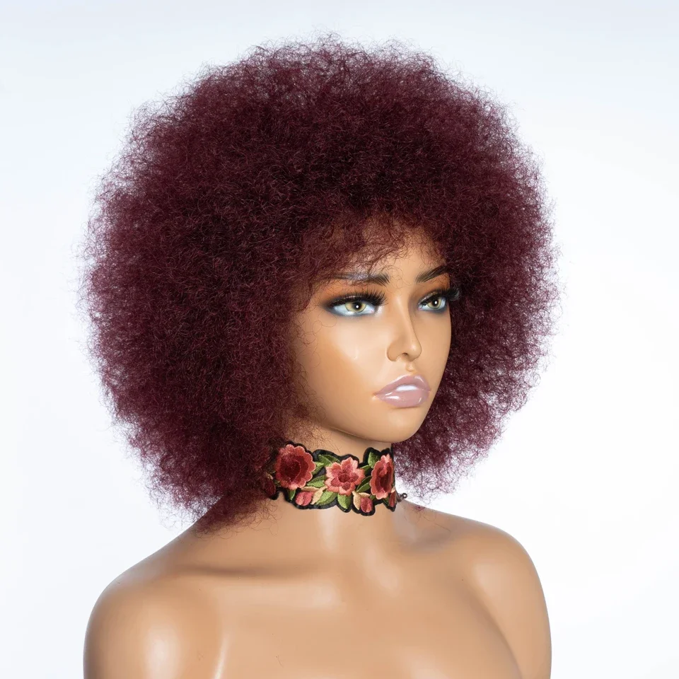 Fluffy Afro Kinky Curly Human Hair Wig With Thick Bangs 99J Red Short Bob Wigs For Black Women 180% Density Full Machine Hair