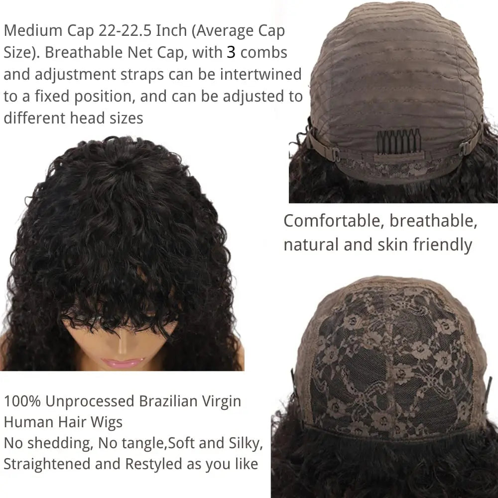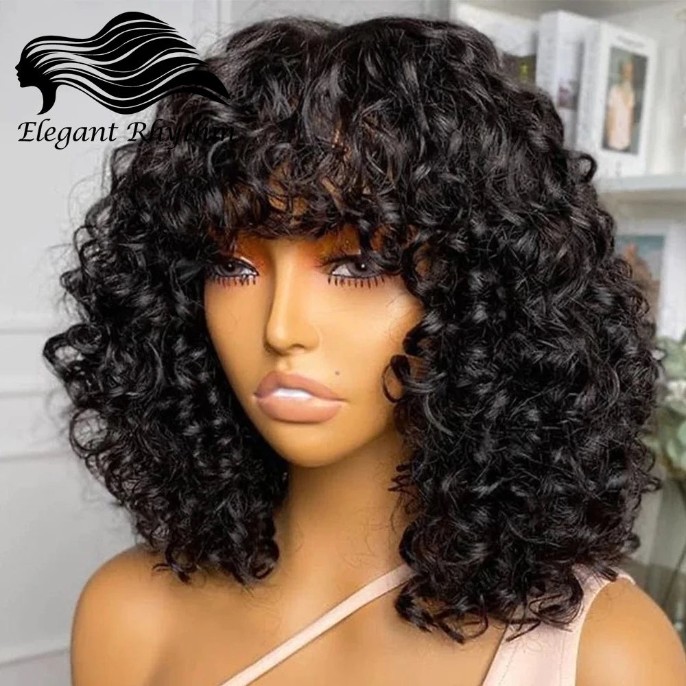 Kinky Curly Wig with Bangs Brazilian Human Hair For Women 180% Density Machine Made Deep Wave Curly Glueless Wigs With Fringe